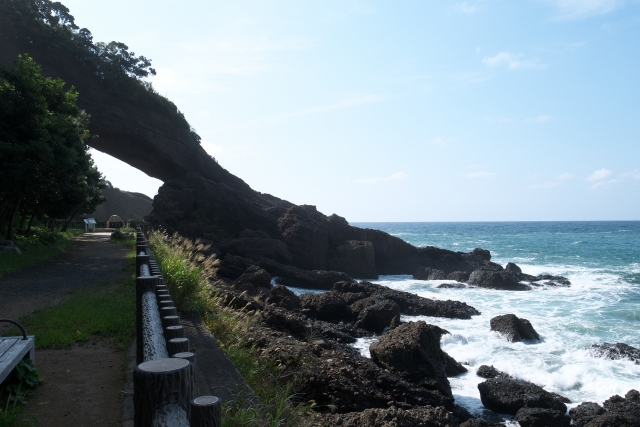 荒々しい岩肌と、どこまでも続く青い日本海のコントラストはまさにフォトジェニック。特に夕暮れ時、アーチの向こう側に沈む夕陽が海を黄金色に染める瞬間は、言葉を失うほどの美しさです。越前海岸のドライブコースの中でも、自然が造り出した造形美を最も体感できるポイントであり、波の音を聞きながら大地のエネルギーを感じられるパワースポットとしても人気を集めています。